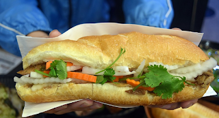 越南法國麵包用麵粉加上米做成,口感跟硬硬的法國麵包很不一樣,裡頭包夾很多餡料,有點類似潛艇堡。