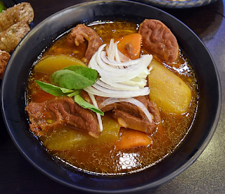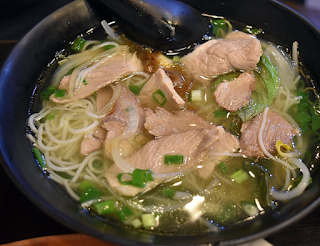豬肉片份量不少,湯頭帶有檸檬與羅勒香氣,加點新鮮檸檬塊與越式辣椒或者辣椒醬,滋味更棒。