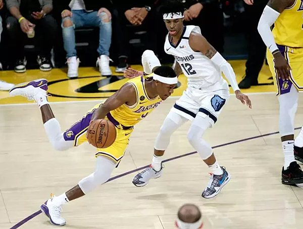 朗多(左)本季出賽48場,其中只有3場先發,平均得分7.1分、助攻5.0次,看似不是很重要的球員,但他的缺賽勢將對湖人拚冠造成不小的影響。 歐新社資料照片